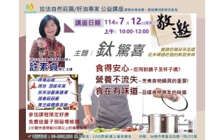 鈦 驚喜 食得安心~您用對鍋子及杯子嗎? 營養不流失~烹煮食物鍋具的重要! 食在有味道~品嚐食物原本的味道 許素貞博士主講