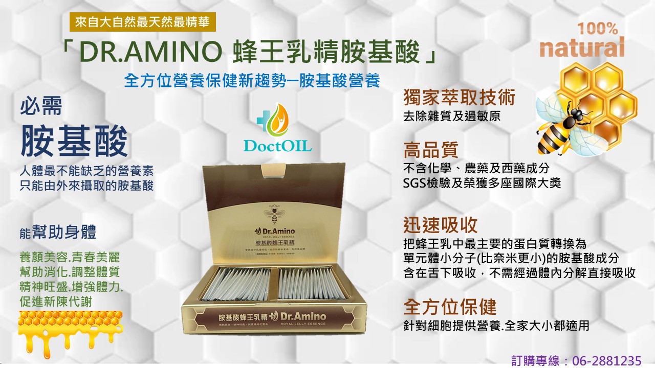 品 名:胺基酸蜂王乳精[細顆粒食品] 成 分:蜂王乳萃取物、乳糖、葡萄糖 內 容 物:30包(3公克/包) 保存期限:三年 產 地:台灣 保存方式:請置於陰涼通風處、避免高溫。 食用方法:直接食用或配開水、飯前飯後皆可。 一般用量:每日早上食用1-2包(小孩減量) 特別用量:每日食用2次以上。