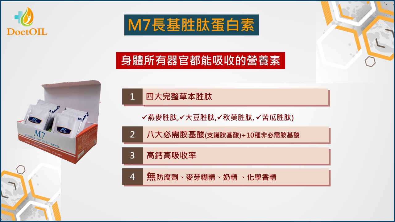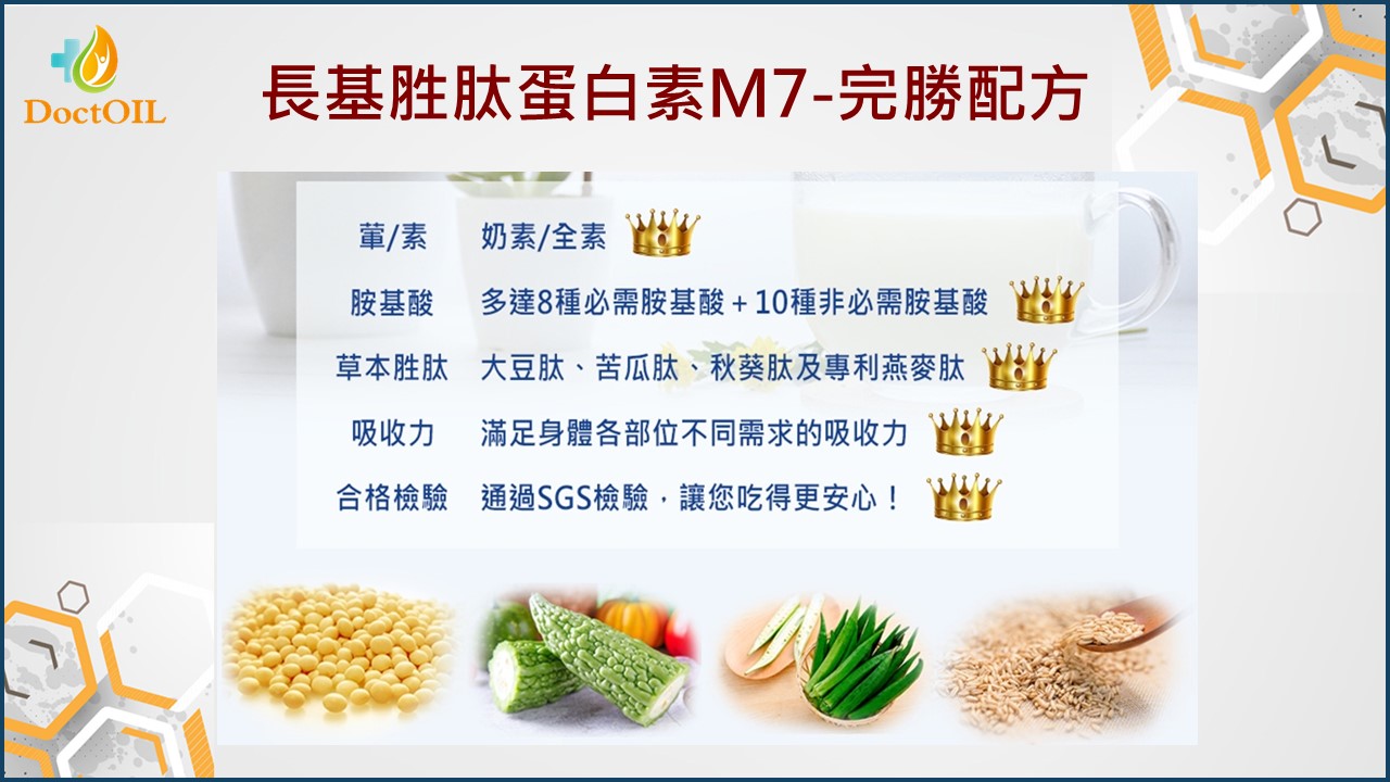分離大豆蛋白、紐西蘭鮮奶粉、綜合草本胜肽〔大豆胜肽、燕麥胜肽、秋葵萃取物(含胜肽)、苦瓜萃取物(含胜肽)〕、豌豆蛋白、乳清胜肽、支鏈胺基酸(白胺酸、異白胺酸、纈胺酸)、精胺酸、紐西蘭牛奶鈣、關華豆膠(屬水溶性膳食纖維)、天然香草香料、麩醯胺酸