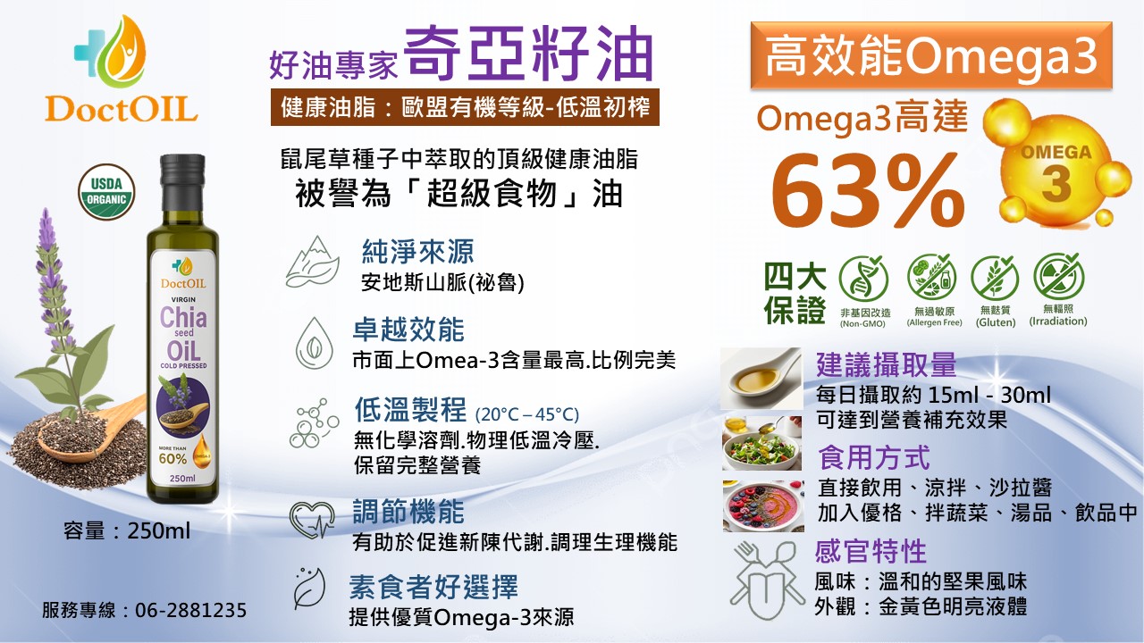 品 名:奇亞籽油 (原裝原瓶進口) 成 分:奇亞籽油 (嚴選有機等級) 內 容 量:250ml/瓶 保存期限:二年 (未開封保存) 產 地:祕魯 保存方式:放置陰涼乾燥處,避免高溫、陽光直射,開封後請儘 速食用完畢。 食用方法:每次15ml。 可直接食用或料理食物中食用,口感極佳。 **純素可食用** ※退換貨須知:7天鑑賞(猶豫)期之權利【鑑賞(猶豫)期非試用期】,辦理退貨商品必須是全新狀態且包裝完整,否則將會影響退貨權限。