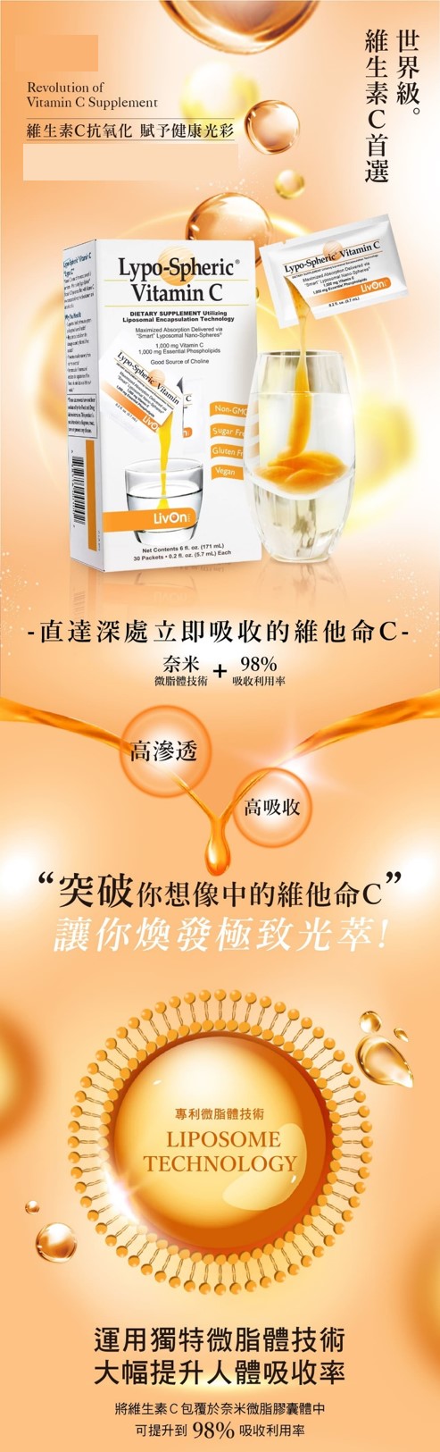 品 名: Lypo-Spheric 微脂體維他命C 成 分:水、維生素C、大豆卵磷脂(含膽素)、酒精、檸檬酸 內 容 物:30包(770毫克/顆) 保存期限:二年 原 產 地:美國 保存方式:置於陰涼乾燥處,切勿冷凍及曝曬高溫。 注意事項:本產品含有大豆卵磷脂,對成分過敏者,應先請教專業醫藥人員後選擇食用。 ※退換貨須知:7天鑑賞(猶豫)期之權利【鑑賞(猶豫)期非試用期】,辦理退貨商品必須是全新狀態且包裝完整,否則將會影響退貨權限。